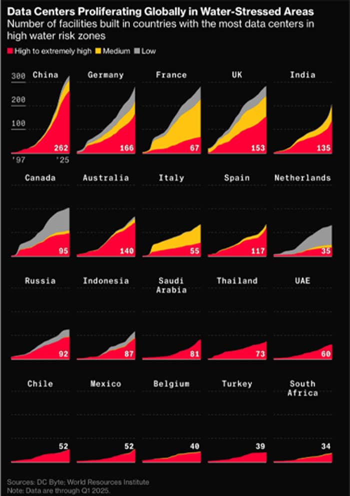 The following picture shows the rapid growth of data centres in regions facing high water stress, emphasising the environmental challenges of infrastructure expansion;